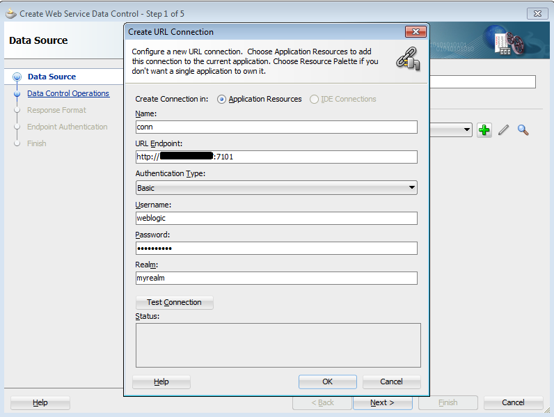 2) In the ApplicationController, invoke the Web Service Data control wizard. Create the connection by specifying authentication type as Basic and supplying the username/password/realm details. Supply the resource URL and after the method configurations, finish the wizard to create the DC.